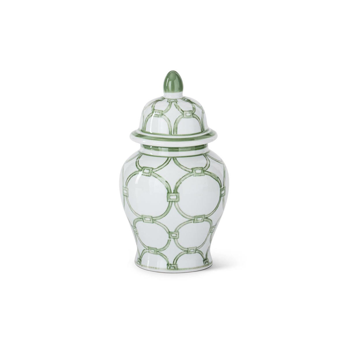 The harmony of green meets the purity of white porcelain in a geometric pattern. Thanks to its classic aesthetic and glossy finish, this ginger jar becomes a standout piece of decor, bringing a touch of timeless elegance to coffee tables, consoles, or mantels.